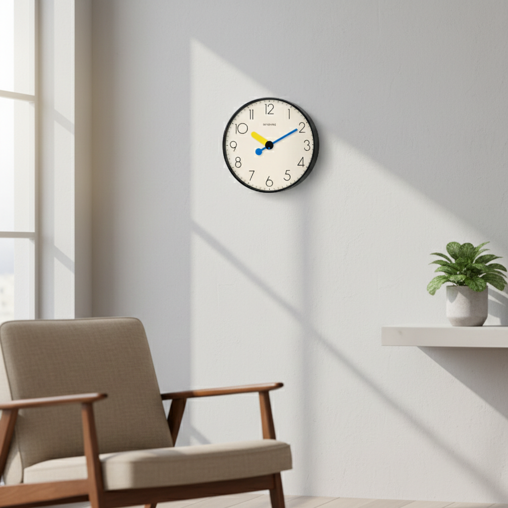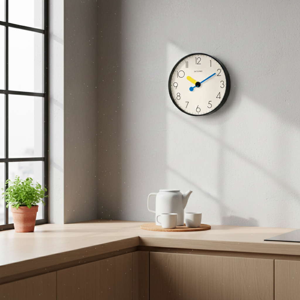 SkyModern: Simple Design, Bold Expression. This minimalist wall clock features a clean 12-hour layout with high-contrast, primary-colored hands for effortless readability. Its silent quartz movement and sleek black frame make it a reliable and stylish addition to any home or office. A perfect blend of everyday utility and modern aesthetics.