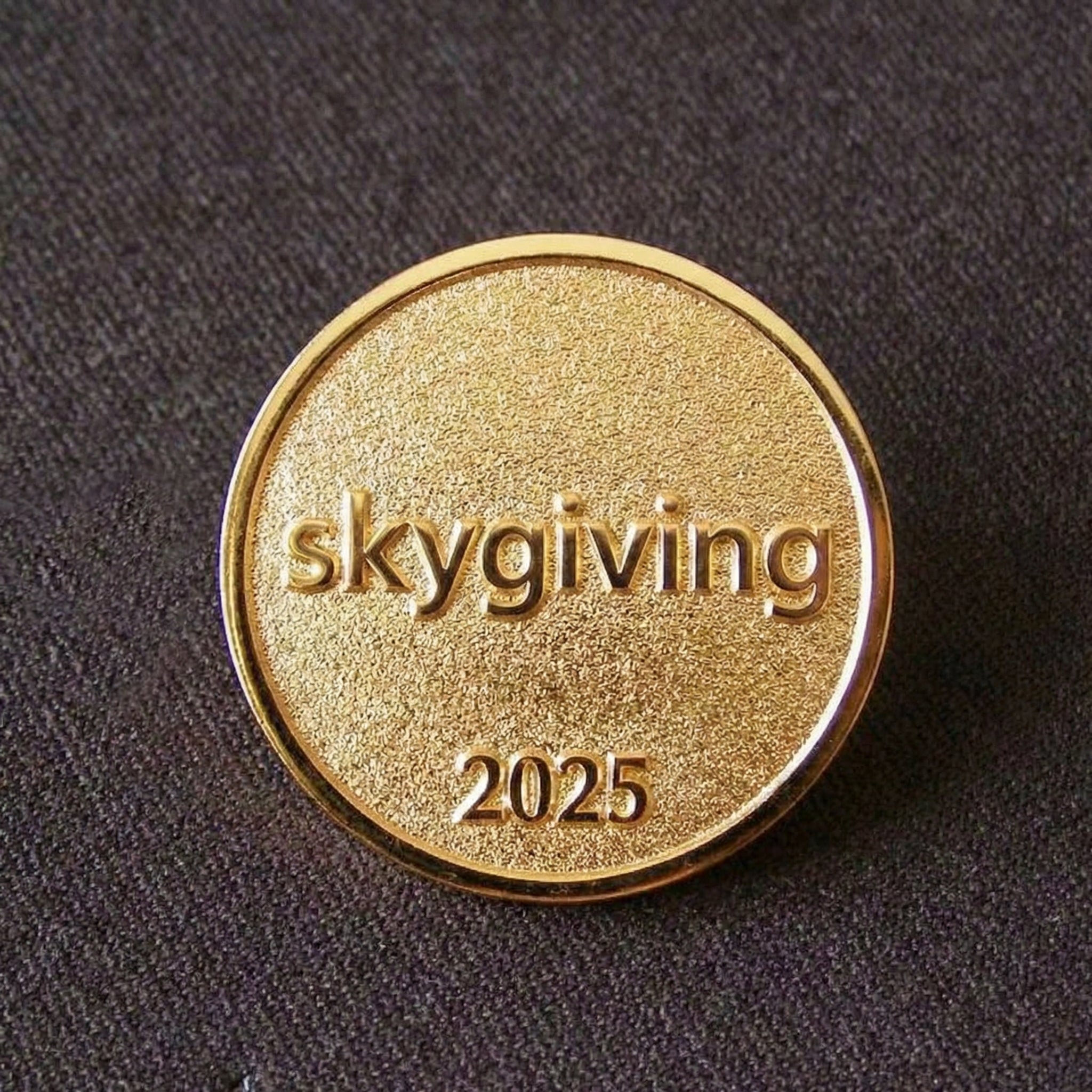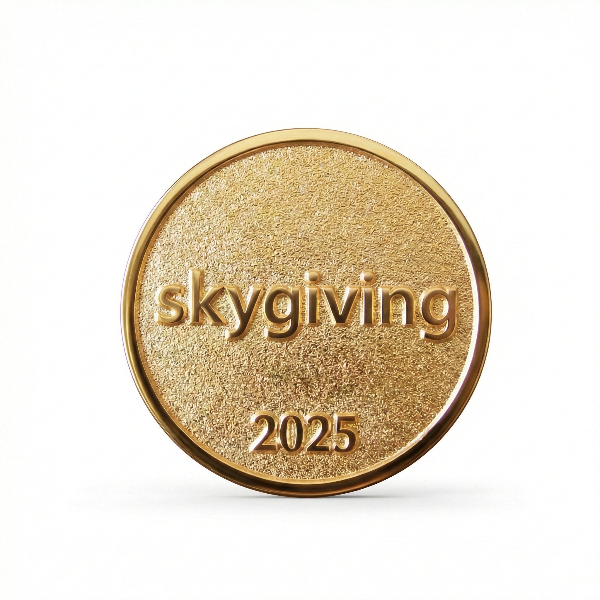 The center is dominated by the bold, embossed SkyGiving hallmark, anchored by the year 2025—a symbol of progress, gratitude, and the enduring spirit of our brand. Whether presented as a corporate award, a donor thank-you, or a personal keepsake, this coin serves as a timeless reminder of the heights we’ve reached together.