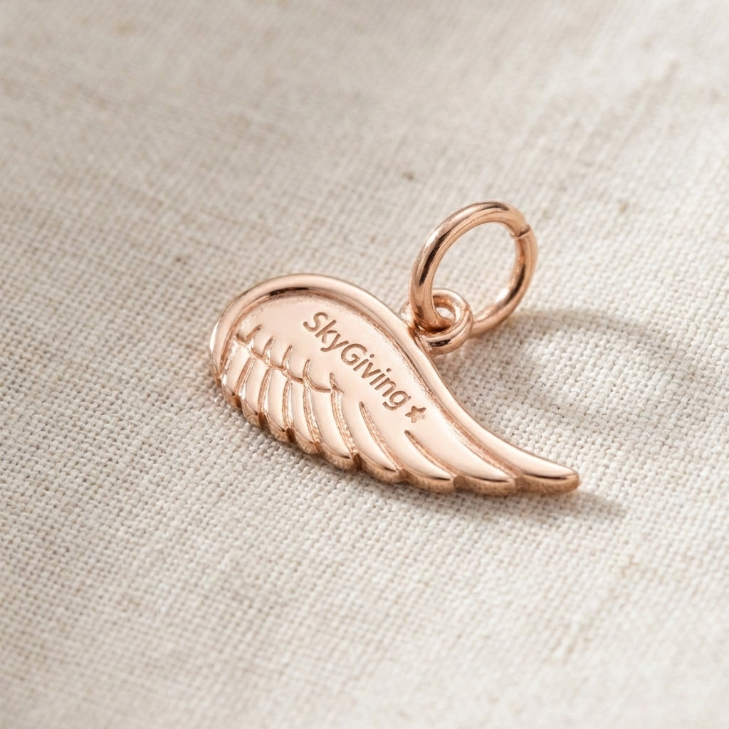 Carry the spirit of freedom. The Aether Wing Charm is a beautifully sculpted accessory featuring intricate feather detailing and a high-polish rose gold finish. Embossed with the SkyGiving hallmark and a tiny guiding star, this piece symbolizes protection, aspiration, and the courage to soar.