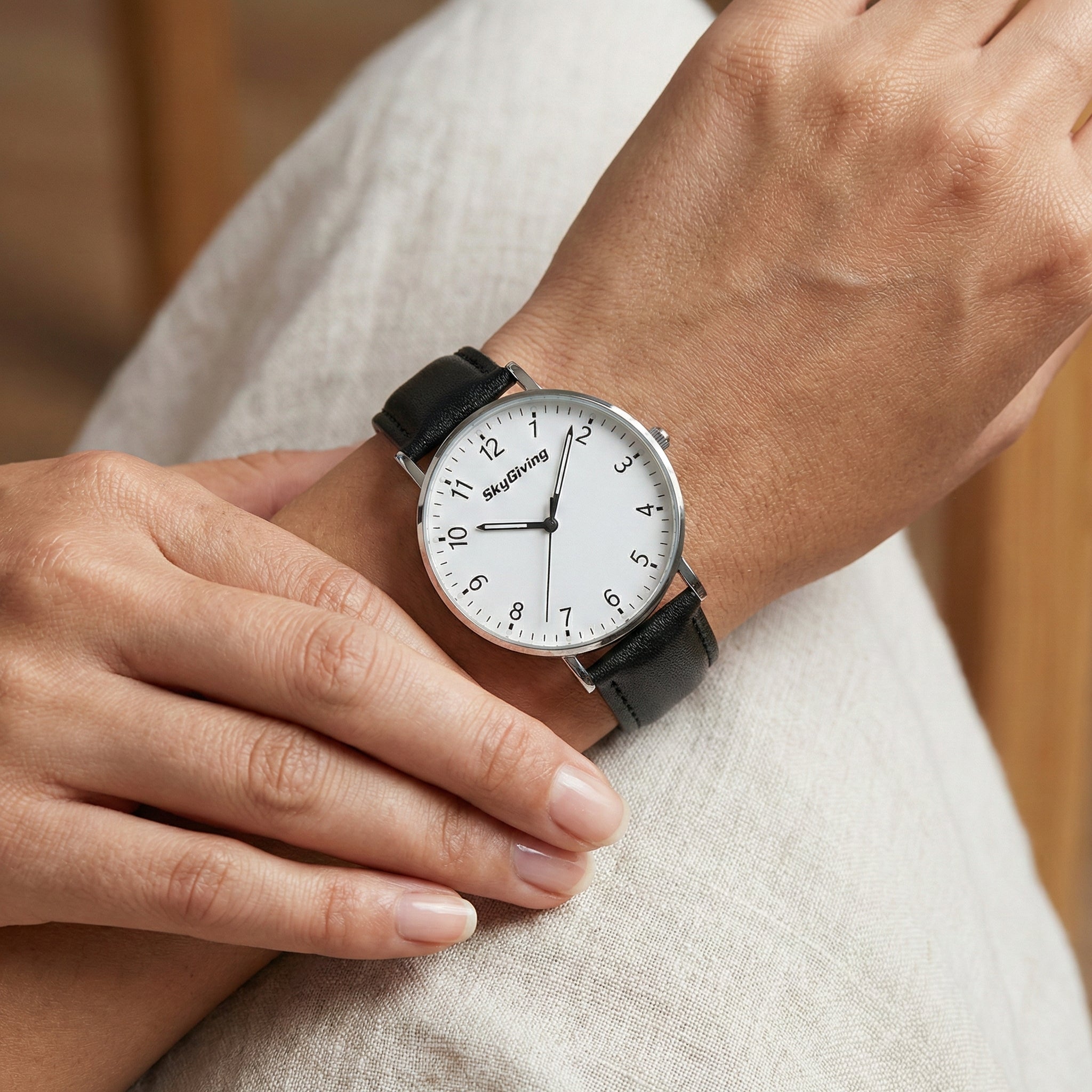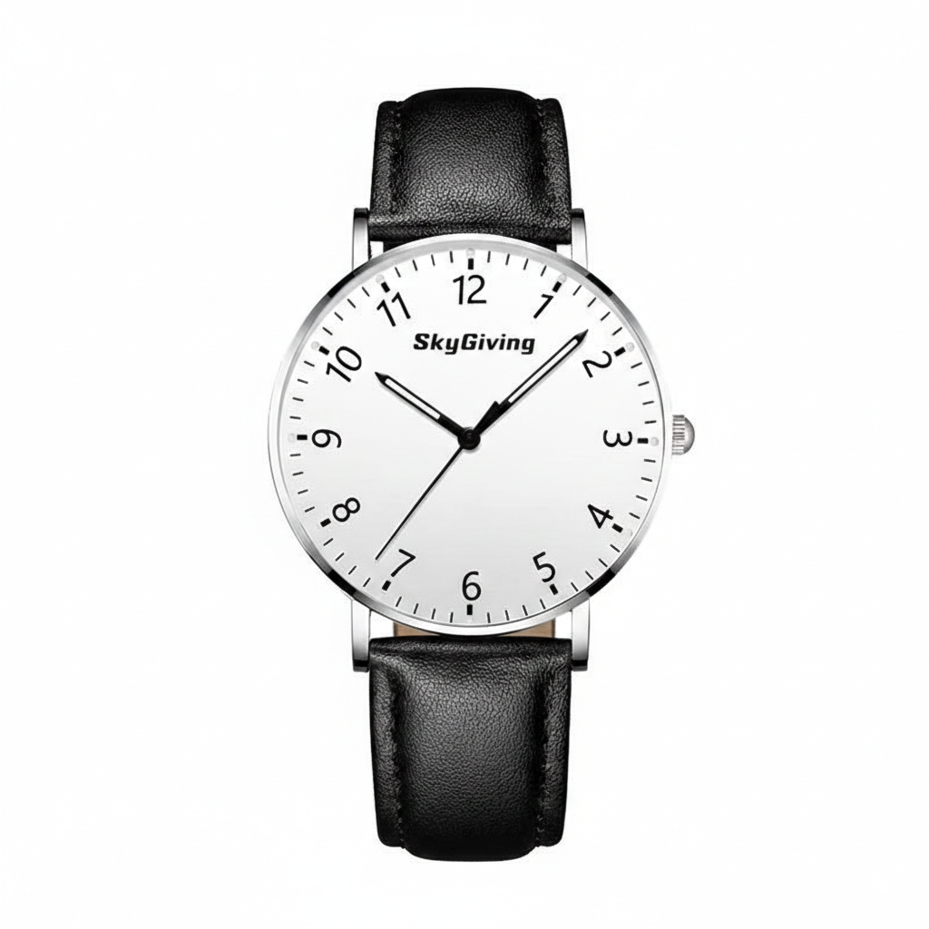 Clarity meets style. The SkyGiving Essence features a high-contrast white dial and bold Arabic numerals for effortless readability. Paired with a sleek black leather strap, this timepiece is a refined daily essential designed for the modern minimalist.