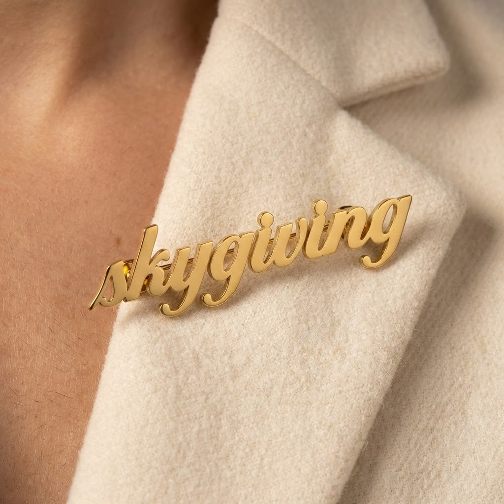 Skygiving Eternal Script Brooch: Elegance in Every Stroke. Transform your style with a touch of fluid artistry. This brooch features the signature "skygiving" in a graceful, handwritten-style font, crafted with a high-shine gold finish. Designed to catch the light and the eye, it’s the perfect sophisticated accent for blazers, coats, or scarves. A timeless statement of grace.