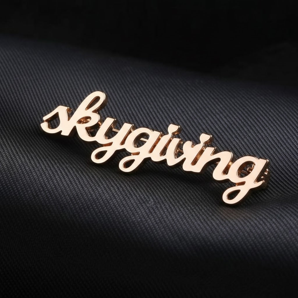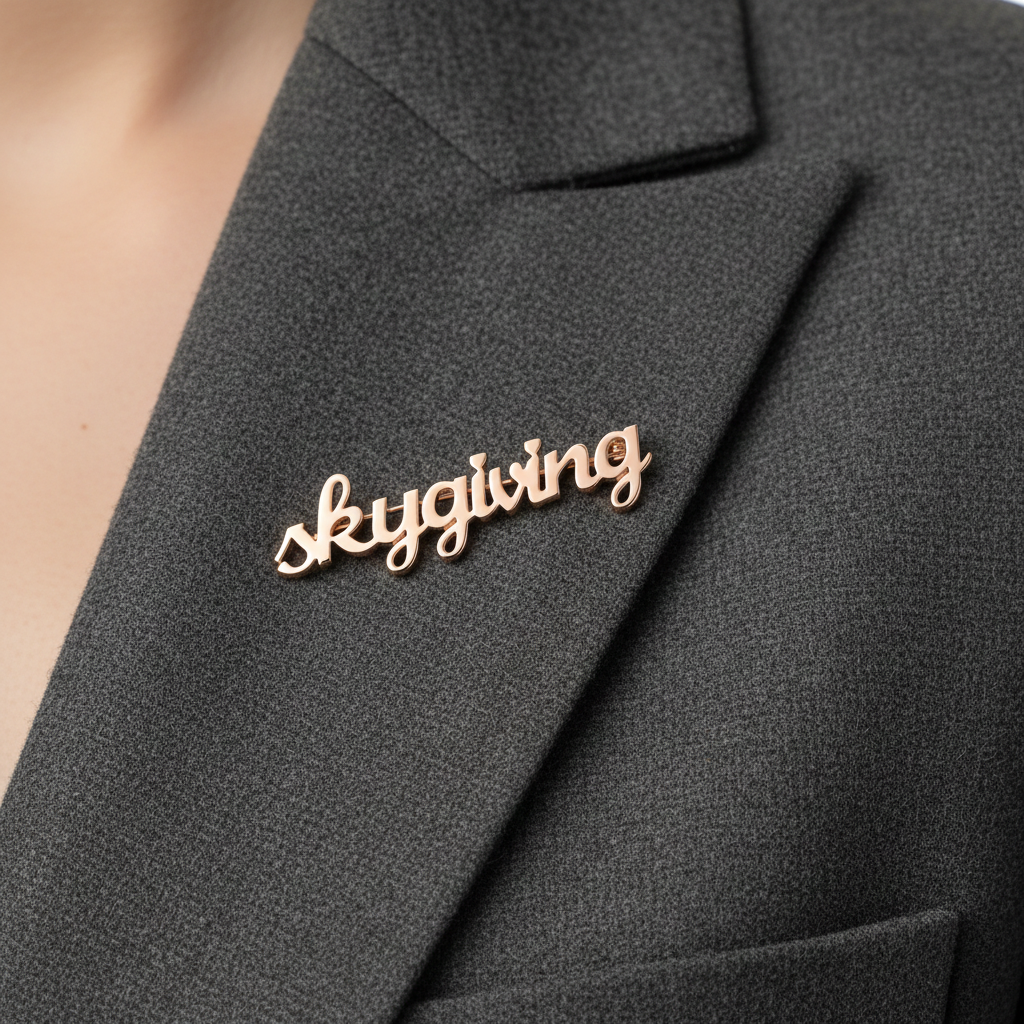 Define your silhouette with a mark of distinction. The SkyGiving Horizon Emblem is more than an accessory; it is a statement of identity. This brooch features our hallmark fluid graphic—an abstract arc symbolizing the limitless reach of the sky—seamlessly integrated with the SkyGiving signature.