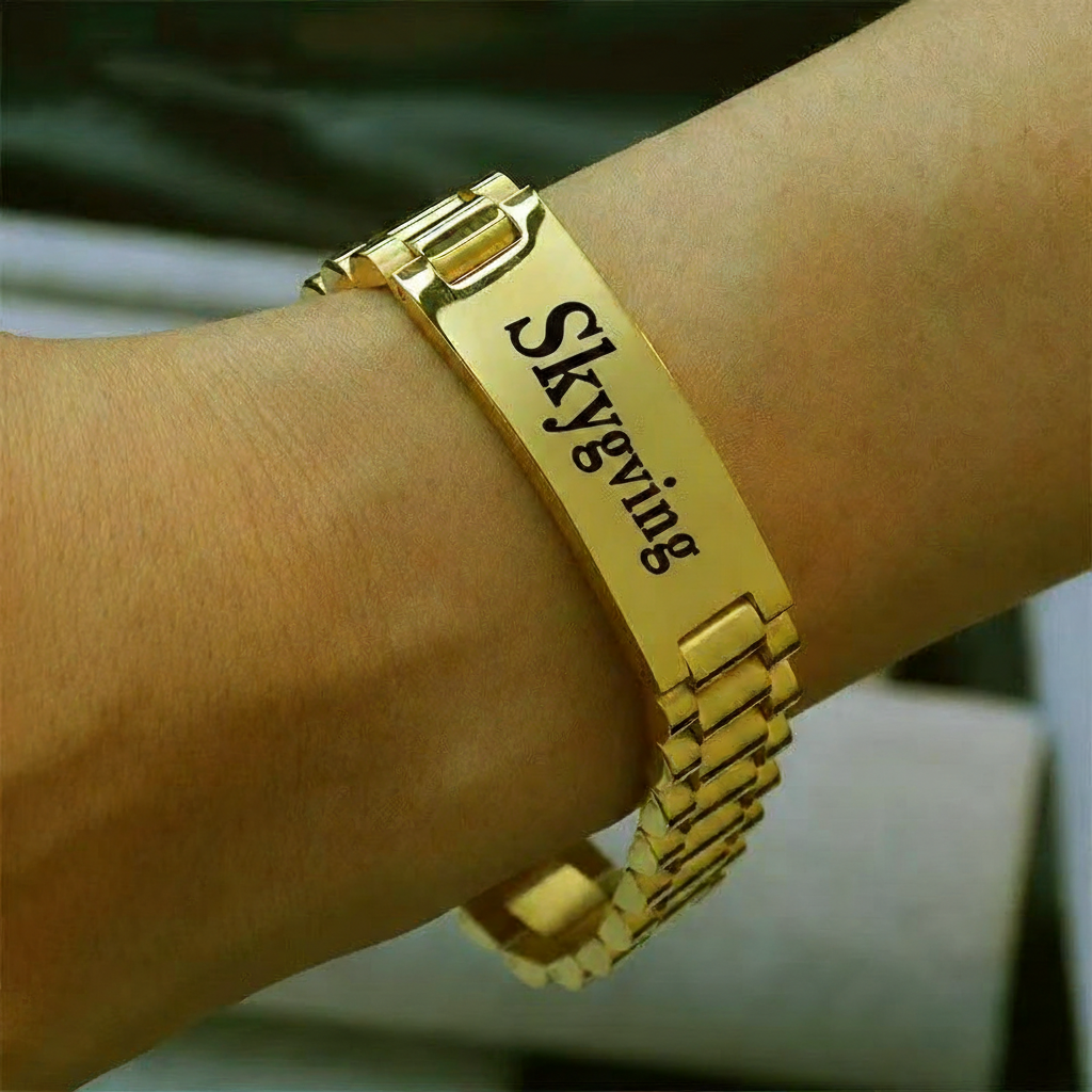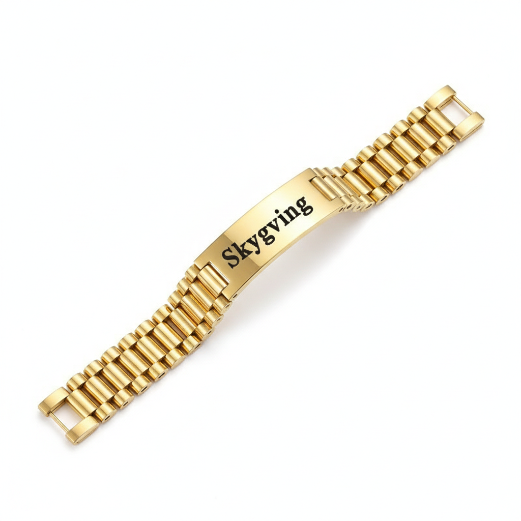 Skygiving ID Link: Define Your Legacy. Crafted from premium polished stainless steel with a rich gold finish, the ID Link bracelet combines industrial strength with personal elegance. Featuring a bold, customizable nameplate and a classic jubilee-style band, it’s designed to be a statement piece that carries your unique mark. Durable, timeless, and distinctly yours.