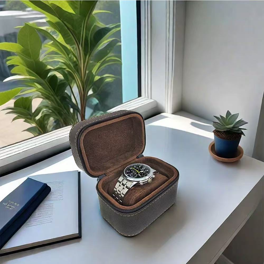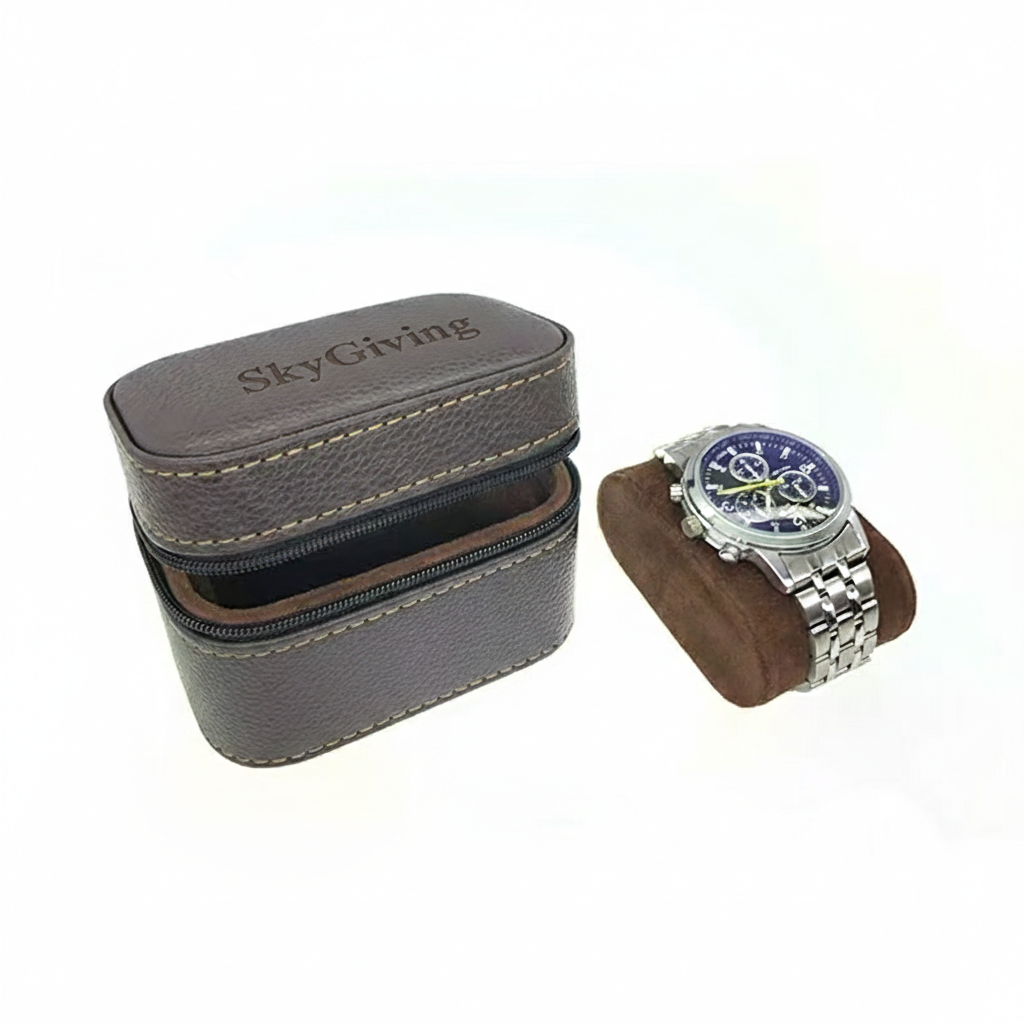 Protection on the go. The SkyGiving Nomad is the essential companion for the modern traveler. Crafted from rugged, pebble-grained espresso leather and lined with a soft velvet interior, this case ensures your timepiece remains scratch-free and secure, whether in a carry-on or on your dresser.