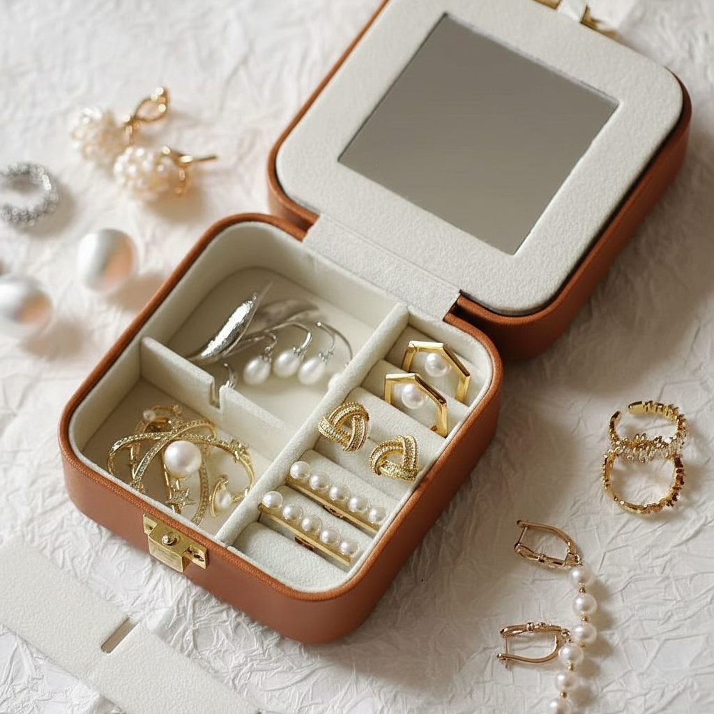 The interior reveals a thoughtfully partitioned layout lined in soft cream velvet, featuring dedicated slots for rings, earrings, and delicate bracelets. A built-in high-definition vanity mirror allows for effortless styling on the go, while the reinforced gold-tone clasp ensures everything stays perfectly in place.