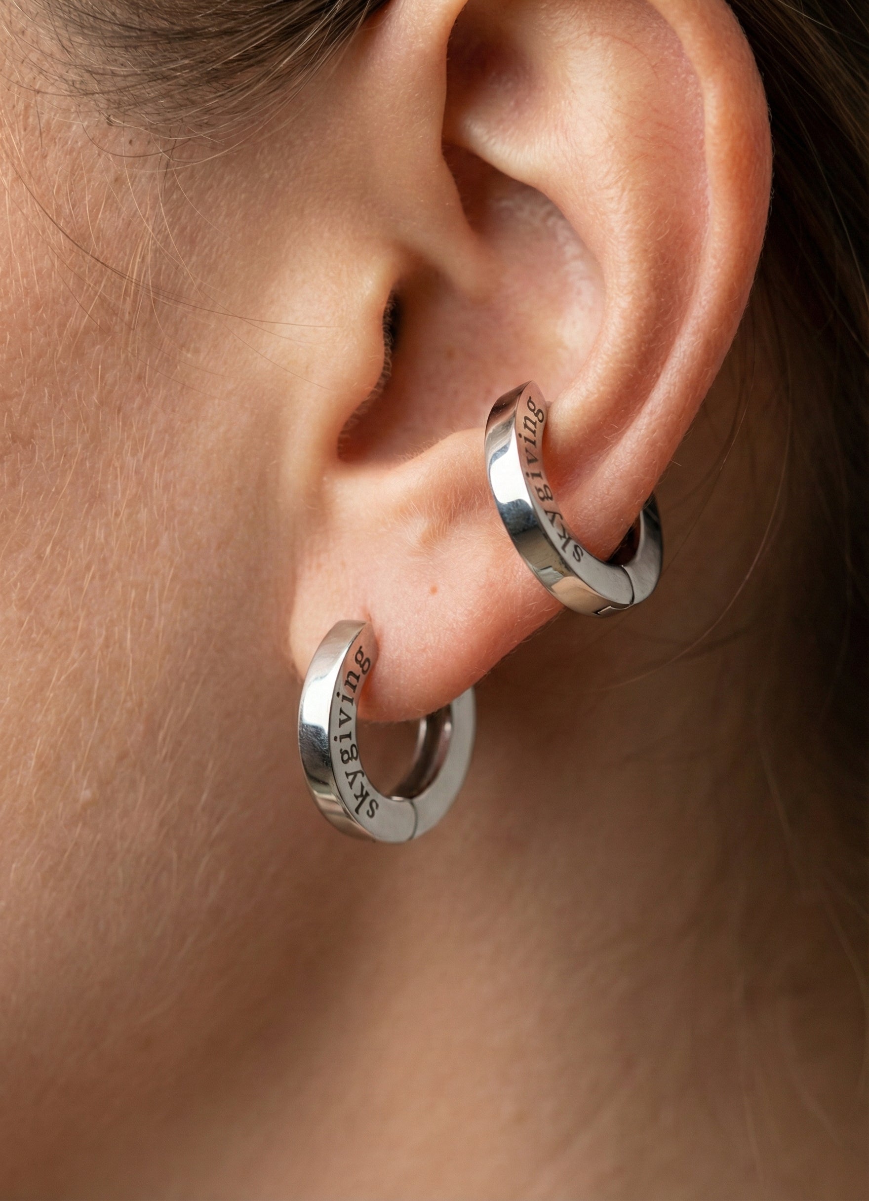 Skygiving Signature Wide Hoop: Boldly Defined. Redefining the classic silhouette with an architectural wide-band design. These hoops aren't just accessories—they're a statement. Featuring precision "skygiving" engraving along the outer edge and a high-shine mirror finish, they offer a perfect blend of street-style grit and modern luxury. Effortless, edgy, and impossible to ignore.