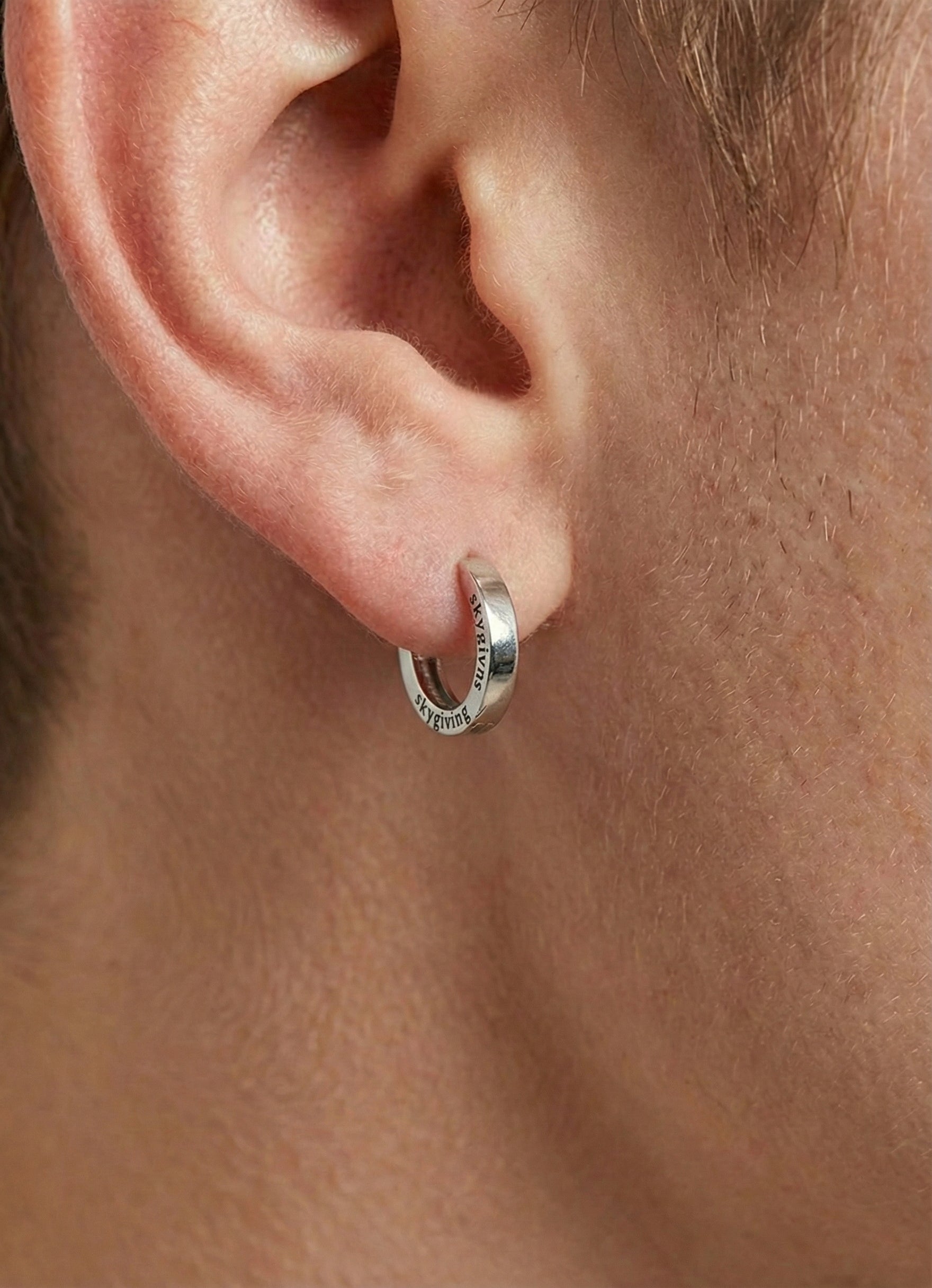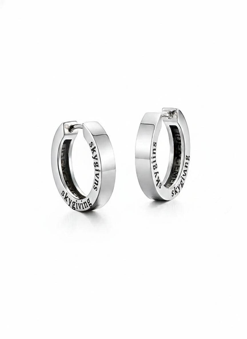 Skygiving Urban Hoop: Boldly Subtle. Engineered for those who move to their own rhythm. These thick-cut silver hoops feature a rugged, industrial edge with the signature "skygiving" engraving for a touch of refined grit. Versatile, high-shine, and unmistakably street. Make your statement without saying a word.